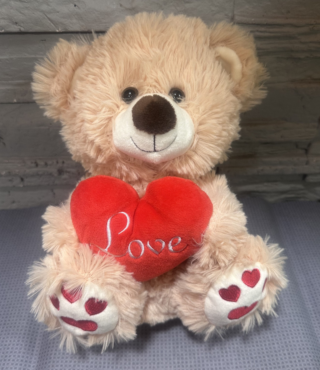 Kb. 25 cm magas plüss maci szívvel.