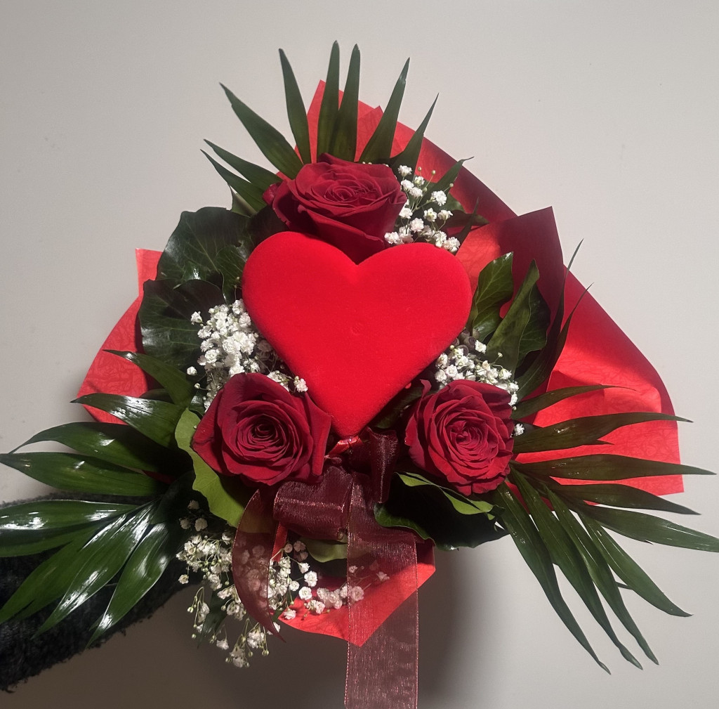 3 szál gyönyörű extra rózsát zöldekkel, pálmalevelekkel díszítünk, majd a rózsák közé egy hangsúlyos szivet rejtünk.