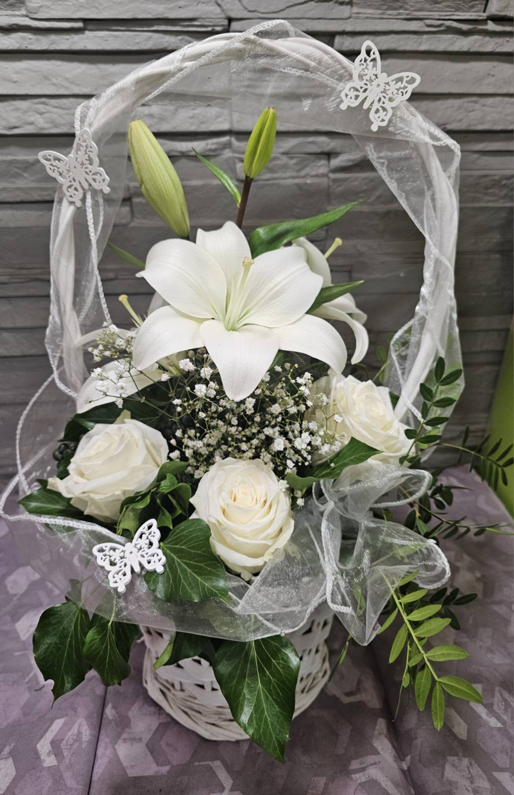 1 szál fehér liliomból és 3 szál fehér rózsából készítjük ezt a májuskosarat a hozzá illő fehér kiegészítőkkel.