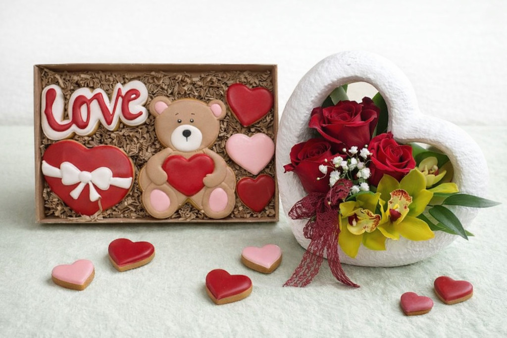 A virágdíszt egy kézzel készült, dekoratív nagy mézeskalács szett egészíti ki, amely szív és egyéb kedves mintákkal díszített, ízletes és esztétikus ajándék egyszerre. A mézeskalács celofánba csomagolva érkezik, így az összeállítás azonnal ajándékozásra kész.